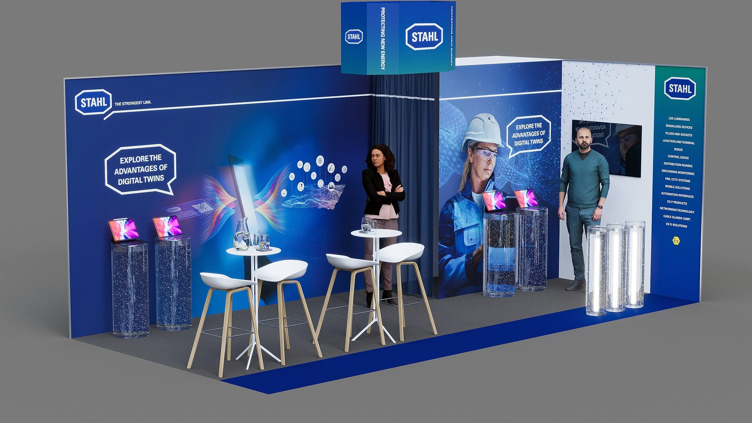 To highlight the products I designed podiums filled with water to display light tubes and illustrations representing their product areas. This project was a successful collaboration with Stahl and KG Fosshagen, a technical partner responsible for equipment, rigging, and assembly. The result was a highly visited stand!