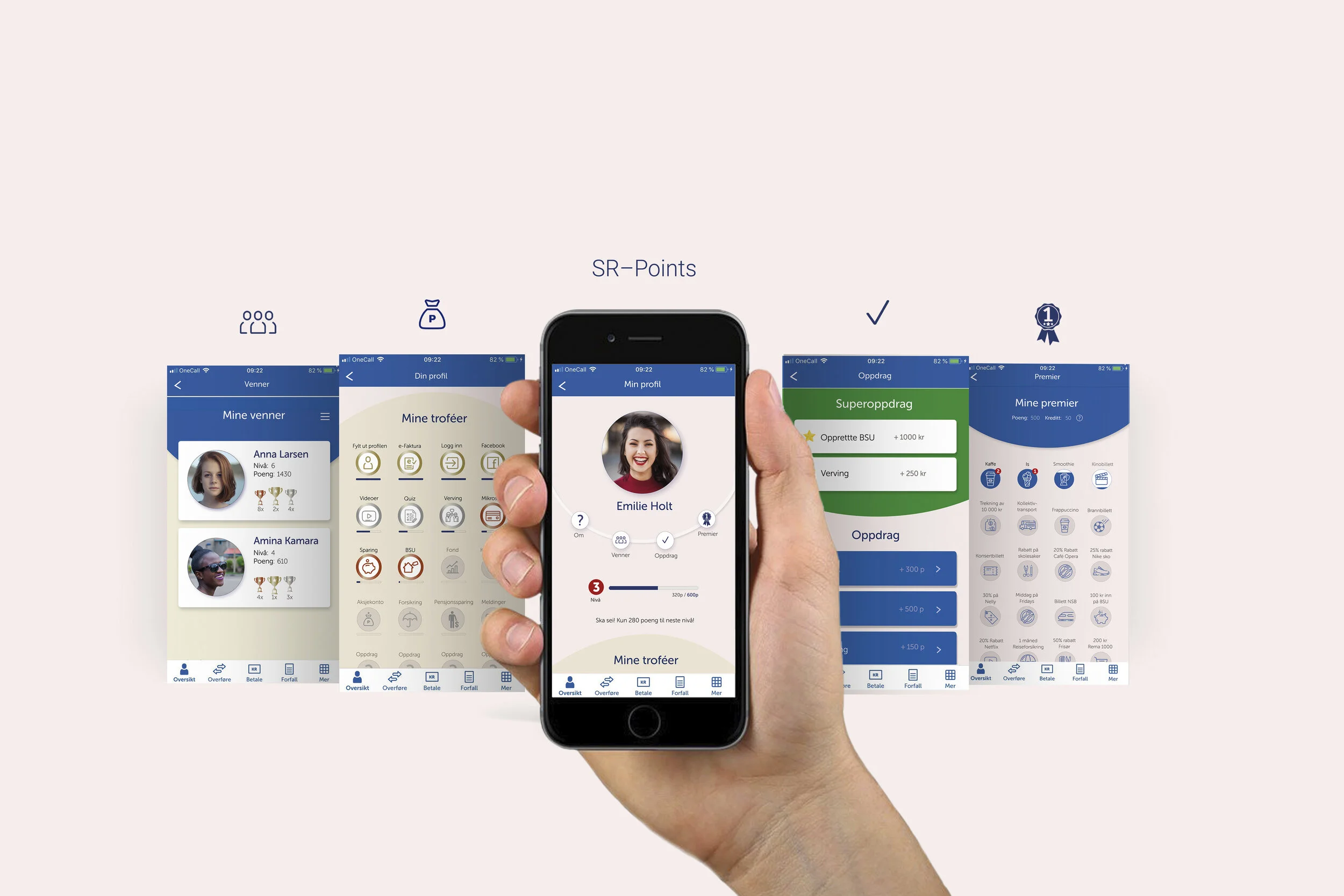 I was a summer intern at Sparebank 1 SR-Bank, the second-largest Norwegian-owned banking institution. Here I worked as a graphic designer in an interdisciplinary team of four. We worked on a project in marketing with the aim to come up with innovative solutions to recruit young customers. To achieve this we used a design thinking methodology which is called: the Google design sprint method. Our work consisted of brainstorming sessions, prototyping, and testing various ideas on the target group. The final concept was gamification integrated into the mobile. We called it SR-Points. This was presented to others in the firm and the management team.